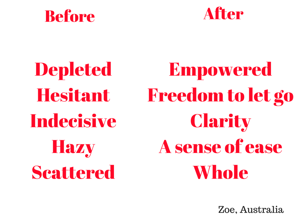 After working with one client Zoe, I asked her for 5 words to describe how she felt before we started working together and how she felt at the end of our time together.
